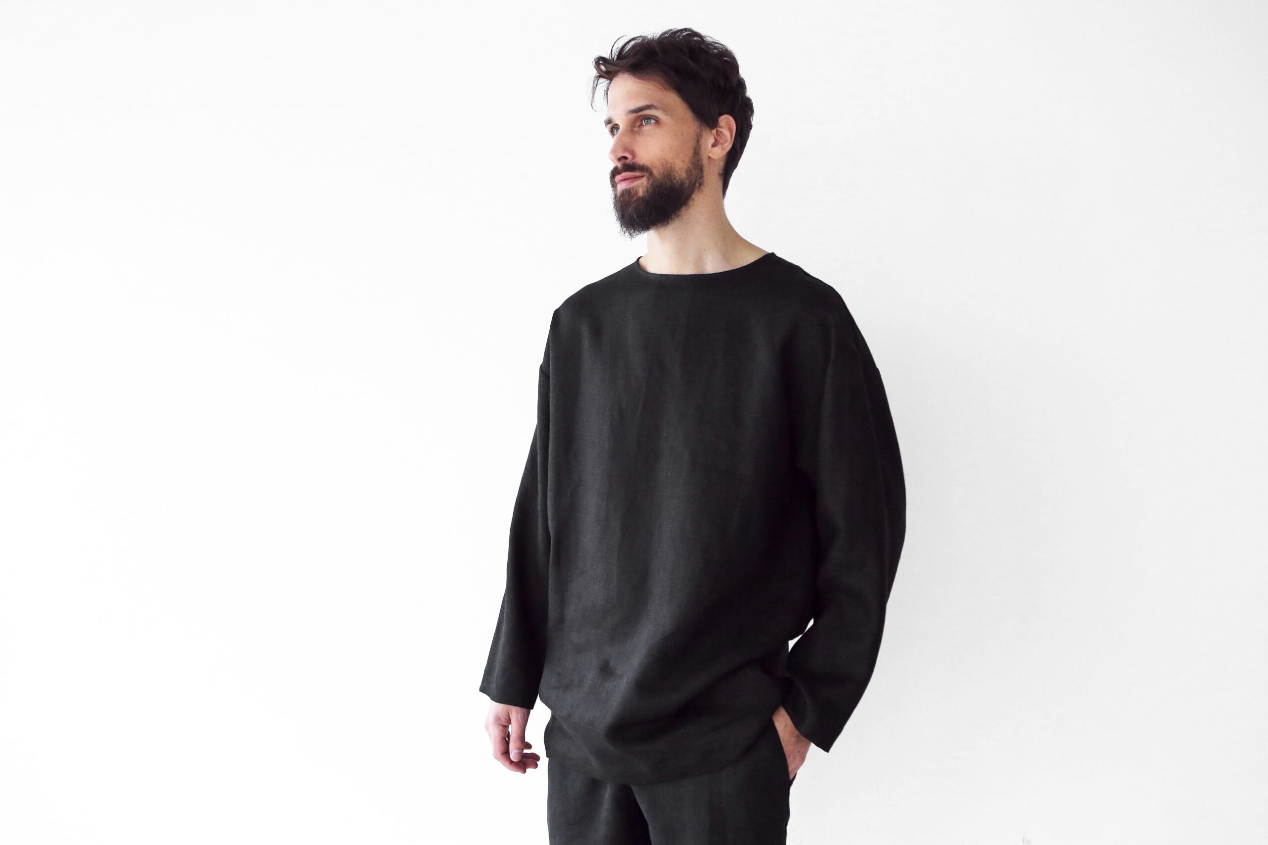 Natural linen. The fabric is natural and takes the body shape, over time it becomes softer. Men’s Linen sweatshirt makes a luxurious and functional gift for that special man in your life.