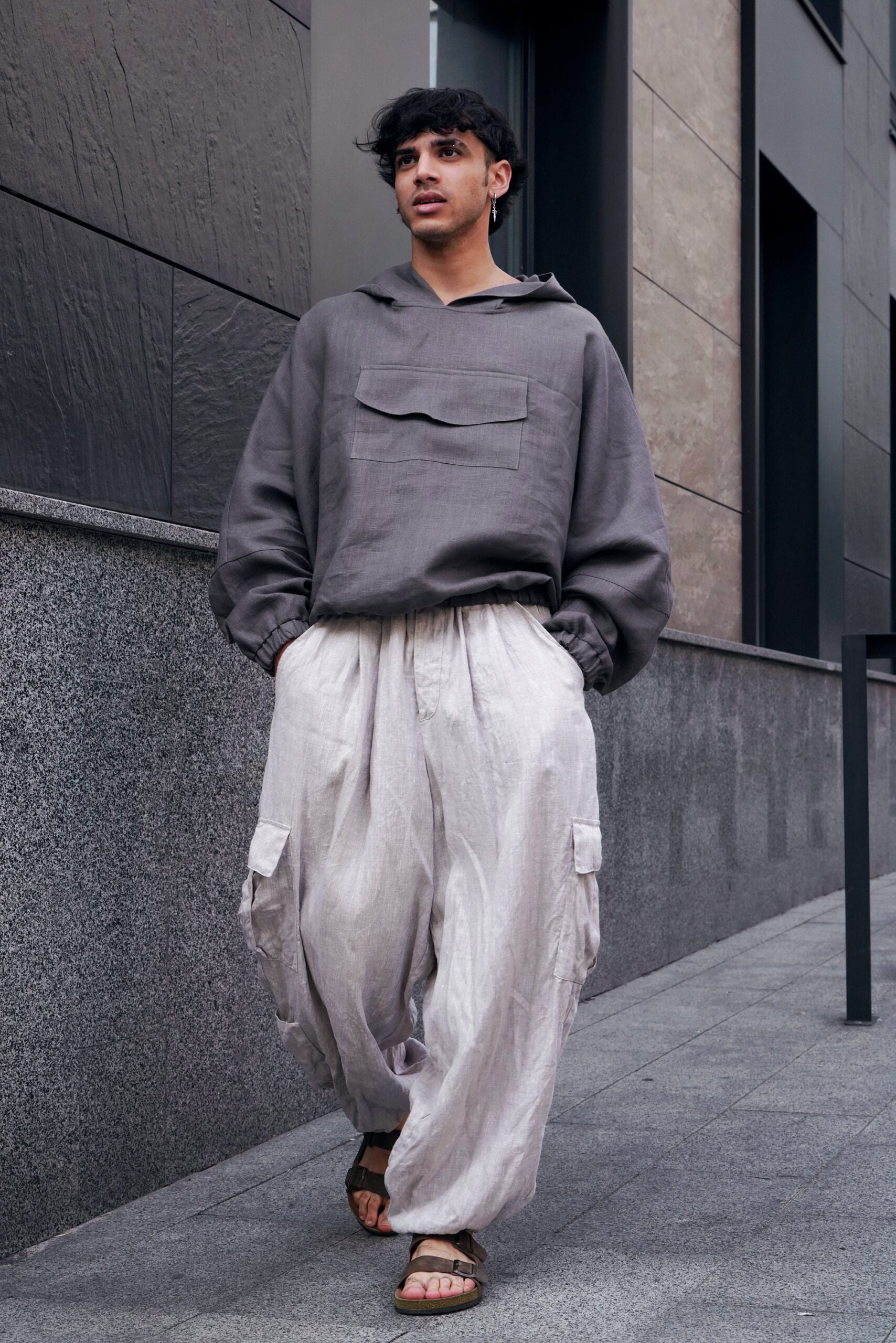 Drawstring Linen Pants Ivory Tone Linen for Men Casual Silhouette