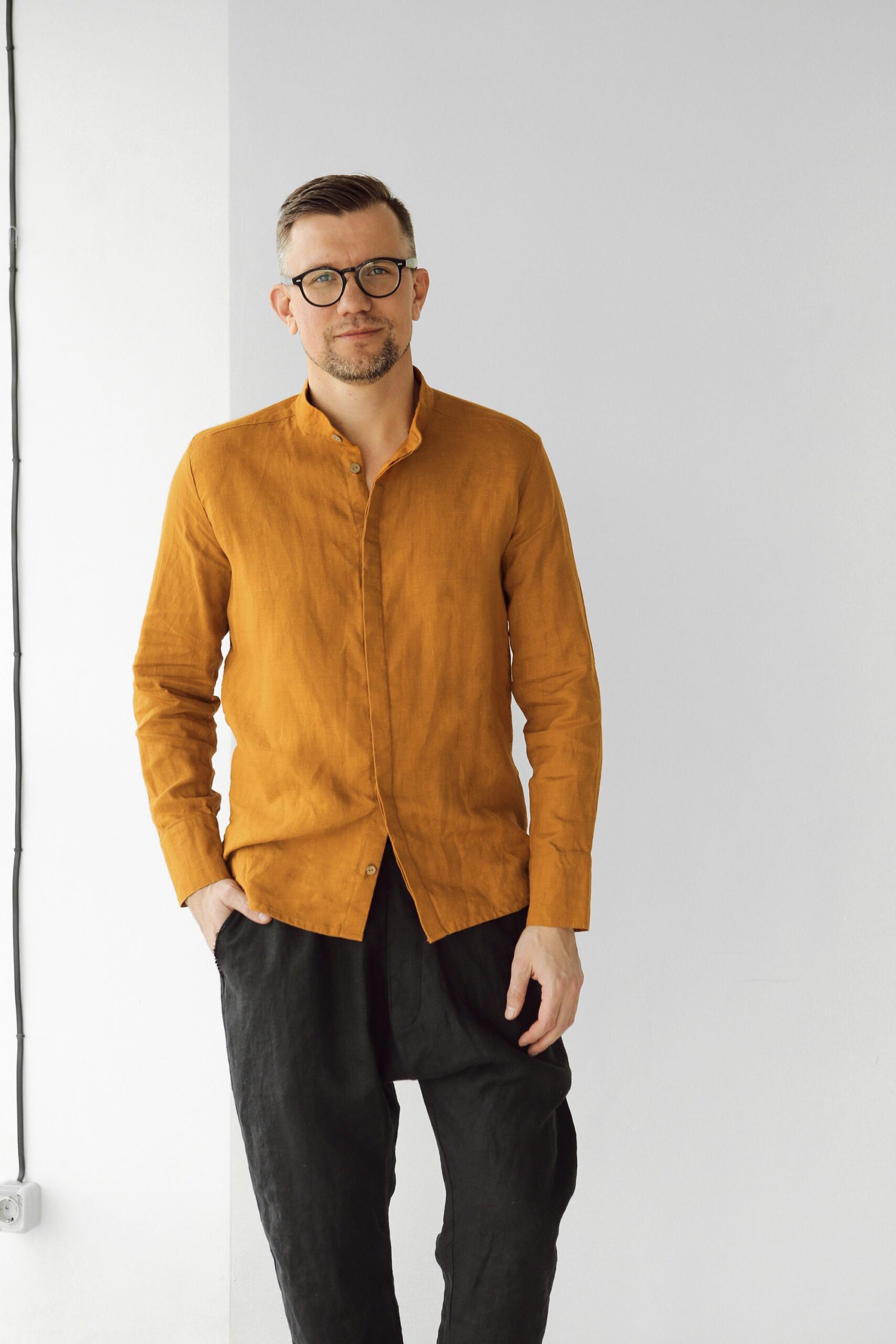 Comfortable and stylish men's shirt. Made from 100% linen and available in many colors. This shirt is versatile, wear it on the street, at the office, business meeting or at home. The natural fabric molds to your body shape and over time becomes softer.
