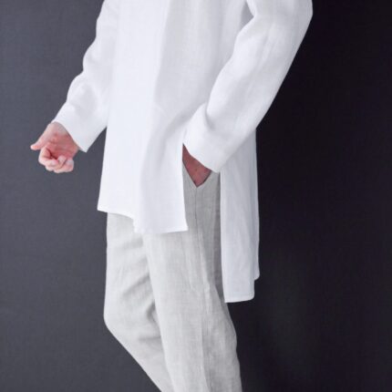 White linen men's dress shirt with wide sleeves.