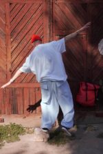 This model has a fabric belt and two elastic rubber bands at the bottom of the pant legs.